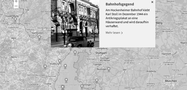 Auf einer Baden-Karte lassen sich markante Ereignisse aus der badischen Landesgeschichte im Wortsinn verorten. Über die bebilderten Kurztexte hinaus, die auf der Karte aufploppen, können die Nutzer:innen per Mausklick nähere Informationen abrufen. Auch von zu Hause aus lässt sich so nachvollziehen, was ‚vor der eigenen Haustür‘ passiert ist. Außerdem gibt das Geschichtsportal über Vorgänge Auskunft, die über das Land Baden hinausreichten – seien es Flucht- und Rettungsaktionen, der Schmuggel illegaler Schriften aus dem Ausland oder die ‚Verschubung‘ von KZ-Häftlingen aus Kislau in andere Lager.